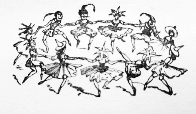 Inside was a raucous scene of music, dancing and feasting. People only two foot high at their tallest, dressed in clothes woven from green sedge fronds. Those dancing in the centre of the revellers wore red woollen capes that flared about their shoulders as they spun like whirling dervishes.